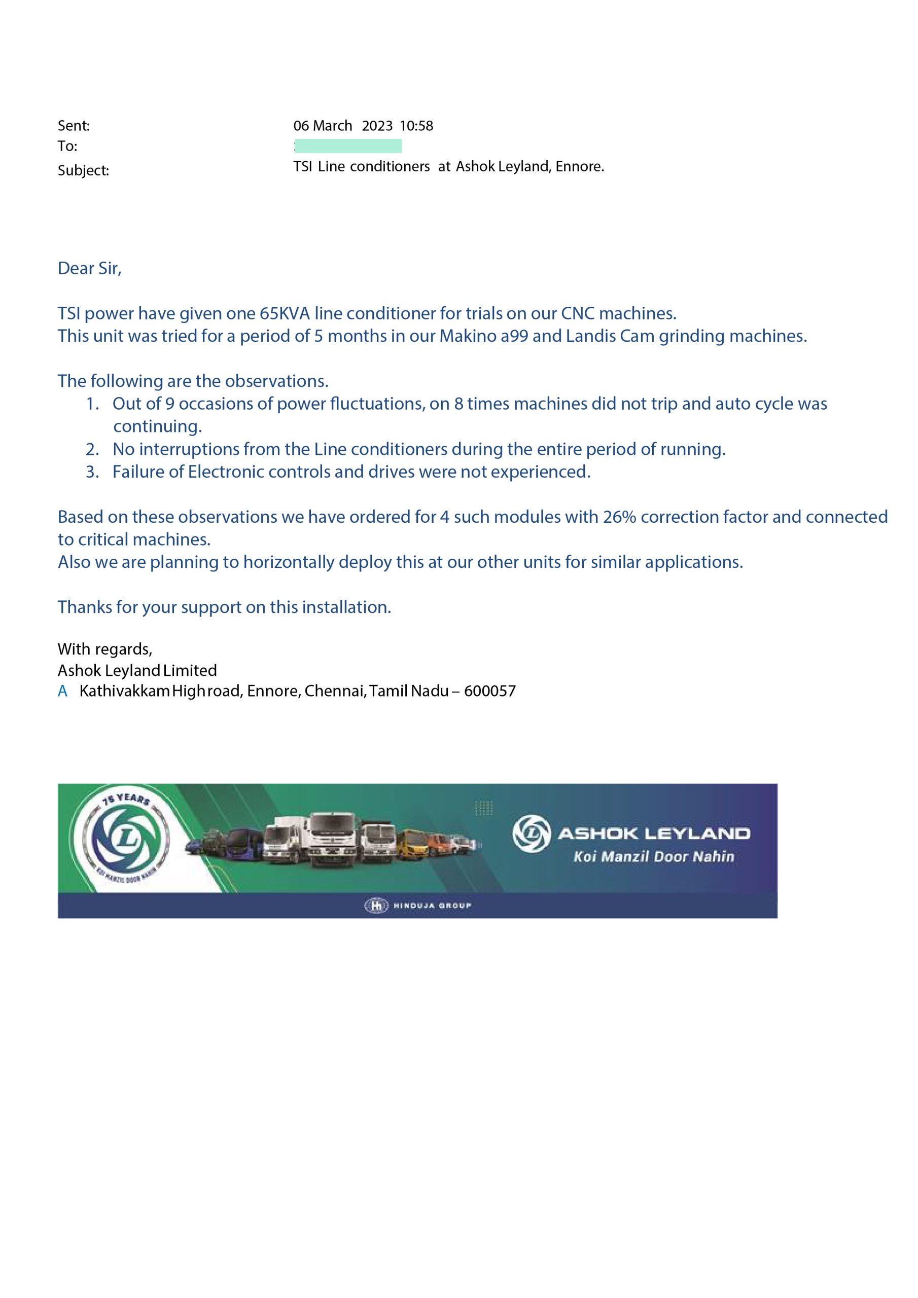Towards the end of August 2021, an expert team from TSi Power, India visited Ashok Leyland’s mother plant. After multiple rounds of discussions and identifying the core power problems, they decided to take a trial of TSi VRP on their Landis Cam Grinding Machine in March 2022 and the results were, as we anticipated, positive.